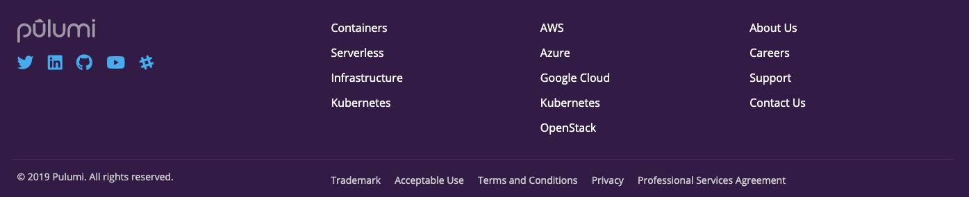 * Move content into docs/content * Make navigation and doc generation work Signed-off-by: Christian Nunciato <c@nunciato.org> * Make search work Signed-off-by: Christian Nunciato <c@nunciato.org> * Move docs-specific layouts into layouts/docs Signed-off-by: Christian Nunciato <c@nunciato.org> * Move docs partials into layouts/partials/docs Signed-off-by: Christian Nunciato <c@nunciato.org> * Share a common header and footer Signed-off-by: Christian Nunciato <c@nunciato.org> * Add product & pricing pages, modify main nav Signed-off-by: Christian Nunciato <c@nunciato.org> * Bring images under assets, docs images under assets/images/docs Signed-off-by: Christian Nunciato <c@nunciato.org> * Link to the docs home page, fix image ref Signed-off-by: Christian Nunciato <c@nunciato.org> * Add containers, serverless, kubernetes topics Signed-off-by: Christian Nunciato <c@nunciato.org> * Add careers Signed-off-by: Christian Nunciato <c@nunciato.org> * Add compete, compete -> migrate Signed-off-by: Christian Nunciato <c@nunciato.org> * About, contact Signed-off-by: Christian Nunciato <c@nunciato.org> * Add legal Signed-off-by: Christian Nunciato <c@nunciato.org> * Add product Signed-off-by: Christian Nunciato <c@nunciato.org> * Add partner content Signed-off-by: Christian Nunciato <c@nunciato.org> * Add webinar Signed-off-by: Christian Nunciato <c@nunciato.org> * Add why-pulumi Signed-off-by: Christian Nunciato <c@nunciato.org> * Add GitHub redirect, support Signed-off-by: Christian Nunciato <c@nunciato.org> * Add blog * Add blog - update post frontmatter * Update content/_index.md Co-Authored-By: Justin Van Patten <jvp@justinvp.com> * Remove drafts & redundant fonts, move asset dirs up a level Signed-off-by: Christian Nunciato <c@nunciato.org> * Reconcile blog navigation Signed-off-by: Christian Nunciato <c@nunciato.org> * Migrate some blog content (#1147) * Reconcile www, blog and docs footer items (#1141) Signed-off-by: Christian Nunciato <c@nunciato.org> * Clean up blog layout (#1148) * Migrate more blog posts (#1157) * Replace Bootstrap with TailwindCSS * Add Tailwind * Create a config directory under assets, move PostCSS and Tailwind configs into it * Remove Bootstrap Sass and JS referemce * Refactor the header, base template, and footer to use Tailwind * Pull TOC Sass into its own partial Signed-off-by: Christian Nunciato <c@nunciato.org> * Refactor the docs home page Signed-off-by: Christian Nunciato <c@nunciato.org> * Refactor docs single, list and section layouts Signed-off-by: Christian Nunciato <c@nunciato.org> * Refactor quickstart-clouds partial Signed-off-by: Christian Nunciato <c@nunciato.org> * Reposition config items to fix syntax highlighting Signed-off-by: Christian Nunciato <c@nunciato.org> * Replace syntax CSS theme with Monokai Signed-off-by: Christian Nunciato <c@nunciato.org> * Add a dark blue for links Signed-off-by: Christian Nunciato <c@nunciato.org> * Add the beginnings of Sass color settings Signed-off-by: Christian Nunciato <c@nunciato.org> * Add a Sass file for langchoose Signed-off-by: Christian Nunciato <c@nunciato.org> * Give no-select its own Sass also, since it’s a partial Signed-off-by: Christian Nunciato <c@nunciato.org> * Give docs single and list templates more width for main content Signed-off-by: Christian Nunciato <c@nunciato.org> * Add some padding to the TOC, since we don’t have proper gutters yet Signed-off-by: Christian Nunciato <c@nunciato.org> * Fix button on Quickstart home page Signed-off-by: Christian Nunciato <c@nunciato.org> * TOC styles Signed-off-by: Christian Nunciato <c@nunciato.org> * Quickstart clouds Signed-off-by: Christian Nunciato <c@nunciato.org> * Padding to left and right columns Signed-off-by: Christian Nunciato <c@nunciato.org> * Black for TOC Signed-off-by: Christian Nunciato <c@nunciato.org> * Refactor docs/aws to use its own layouts Signed-off-by: Christian Nunciato <c@nunciato.org> * Fix the AWS tech partner image Signed-off-by: Christian Nunciato <c@nunciato.org> * Adjust AWS layouts Signed-off-by: Christian Nunciato <c@nunciato.org> * Move docs-home markup into a layout Signed-off-by: Christian Nunciato <c@nunciato.org> * Format the mini-toc Signed-off-by: Christian Nunciato <c@nunciato.org> * Reduce subhead sizes a bit Signed-off-by: Christian Nunciato <c@nunciato.org> * Remove snowflake styles Signed-off-by: Christian Nunciato <c@nunciato.org> * Extract some Sass partials Signed-off-by: Christian Nunciato <c@nunciato.org> * Define initial purple and blue palettes, use numbered colors instead Signed-off-by: Christian Nunciato <c@nunciato.org> * Refactor blog templates Signed-off-by: Christian Nunciato <c@nunciato.org> * Make blog summary a partial, style pagination Signed-off-by: Christian Nunciato <c@nunciato.org> * Fix expanded URLs Signed-off-by: Christian Nunciato <c@nunciato.org> * Rename Documentation to Reference Signed-off-by: Christian Nunciato <c@nunciato.org> * A smattering of minor adjustments Signed-off-by: Christian Nunciato <c@nunciato.org> * Selection state for tags Signed-off-by: Christian Nunciato <c@nunciato.org> * Delete more Bootstrap Signed-off-by: Christian Nunciato <c@nunciato.org> * Comment the banner Signed-off-by: Christian Nunciato <c@nunciato.org> * Restore footer links Signed-off-by: Christian Nunciato <c@nunciato.org> * Legal layout Signed-off-by: Christian Nunciato <c@nunciato.org> * Remove unused layout Signed-off-by: Christian Nunciato <c@nunciato.org> * Refactor careers page Signed-off-by: Christian Nunciato <c@nunciato.org> * Use top-level URLs for legal docs Signed-off-by: Christian Nunciato <c@nunciato.org> * Add RSS for the blog (#1170) * Add RSS for the blog * Cleanup team data (#1195) * Cleanup team data * Add missing newlines at EOF * Blog content as of 6/16 (#1196) * Blog content layout tweaks * Migrated blog content (as of Sun 6/16) * Address PR feedback, replace links to pulumi.io * Add fusion stack Any changes to the `fusion` branch will now be deployed to https://fusion.pul
