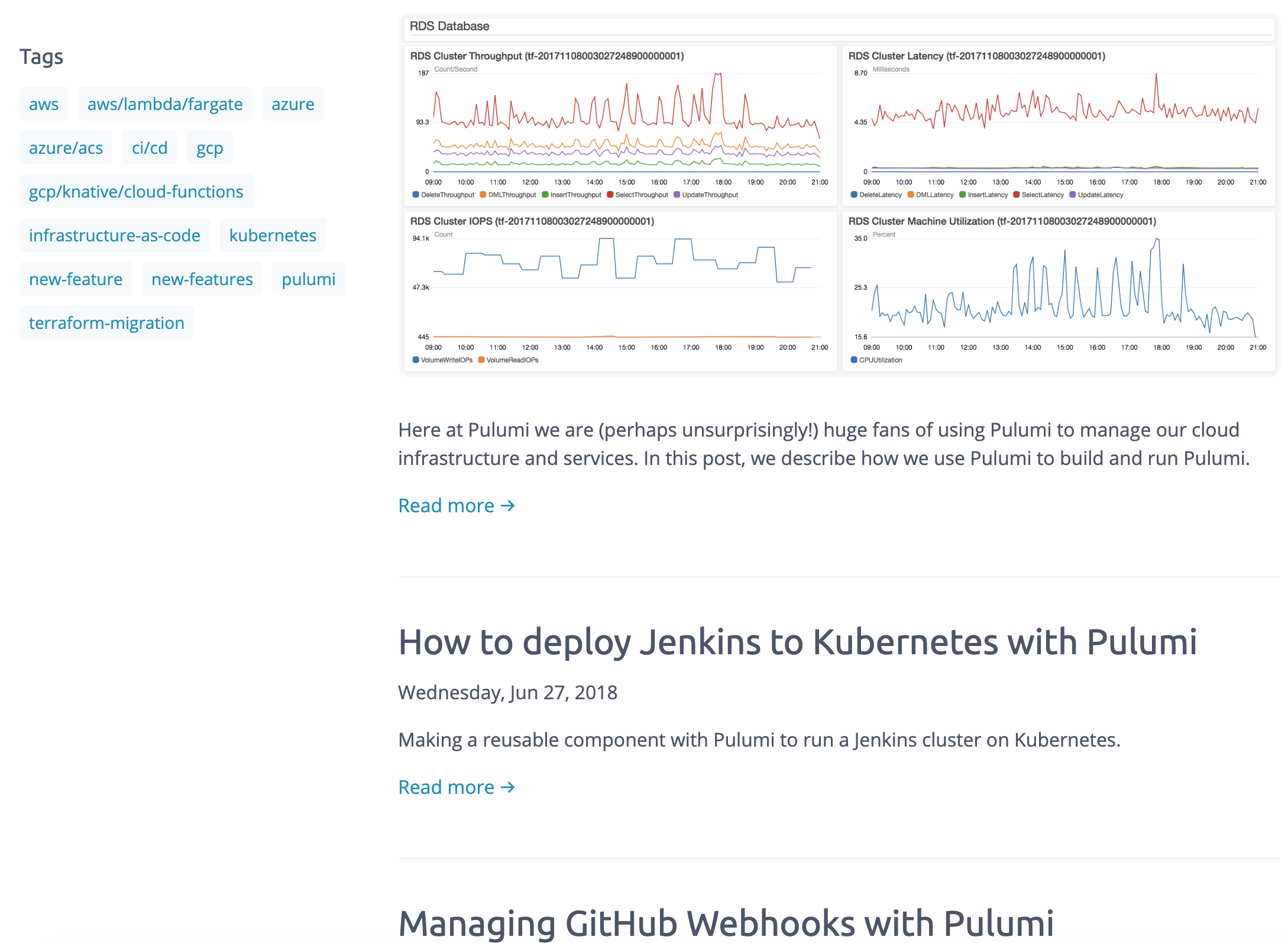 * Move content into docs/content * Make navigation and doc generation work Signed-off-by: Christian Nunciato <c@nunciato.org> * Make search work Signed-off-by: Christian Nunciato <c@nunciato.org> * Move docs-specific layouts into layouts/docs Signed-off-by: Christian Nunciato <c@nunciato.org> * Move docs partials into layouts/partials/docs Signed-off-by: Christian Nunciato <c@nunciato.org> * Share a common header and footer Signed-off-by: Christian Nunciato <c@nunciato.org> * Add product & pricing pages, modify main nav Signed-off-by: Christian Nunciato <c@nunciato.org> * Bring images under assets, docs images under assets/images/docs Signed-off-by: Christian Nunciato <c@nunciato.org> * Link to the docs home page, fix image ref Signed-off-by: Christian Nunciato <c@nunciato.org> * Add containers, serverless, kubernetes topics Signed-off-by: Christian Nunciato <c@nunciato.org> * Add careers Signed-off-by: Christian Nunciato <c@nunciato.org> * Add compete, compete -> migrate Signed-off-by: Christian Nunciato <c@nunciato.org> * About, contact Signed-off-by: Christian Nunciato <c@nunciato.org> * Add legal Signed-off-by: Christian Nunciato <c@nunciato.org> * Add product Signed-off-by: Christian Nunciato <c@nunciato.org> * Add partner content Signed-off-by: Christian Nunciato <c@nunciato.org> * Add webinar Signed-off-by: Christian Nunciato <c@nunciato.org> * Add why-pulumi Signed-off-by: Christian Nunciato <c@nunciato.org> * Add GitHub redirect, support Signed-off-by: Christian Nunciato <c@nunciato.org> * Add blog * Add blog - update post frontmatter * Update content/_index.md Co-Authored-By: Justin Van Patten <jvp@justinvp.com> * Remove drafts & redundant fonts, move asset dirs up a level Signed-off-by: Christian Nunciato <c@nunciato.org> * Reconcile blog navigation Signed-off-by: Christian Nunciato <c@nunciato.org> * Migrate some blog content (#1147) * Reconcile www, blog and docs footer items (#1141) Signed-off-by: Christian Nunciato <c@nunciato.org> * Clean up blog layout (#1148) * Migrate more blog posts (#1157) * Replace Bootstrap with TailwindCSS * Add Tailwind * Create a config directory under assets, move PostCSS and Tailwind configs into it * Remove Bootstrap Sass and JS referemce * Refactor the header, base template, and footer to use Tailwind * Pull TOC Sass into its own partial Signed-off-by: Christian Nunciato <c@nunciato.org> * Refactor the docs home page Signed-off-by: Christian Nunciato <c@nunciato.org> * Refactor docs single, list and section layouts Signed-off-by: Christian Nunciato <c@nunciato.org> * Refactor quickstart-clouds partial Signed-off-by: Christian Nunciato <c@nunciato.org> * Reposition config items to fix syntax highlighting Signed-off-by: Christian Nunciato <c@nunciato.org> * Replace syntax CSS theme with Monokai Signed-off-by: Christian Nunciato <c@nunciato.org> * Add a dark blue for links Signed-off-by: Christian Nunciato <c@nunciato.org> * Add the beginnings of Sass color settings Signed-off-by: Christian Nunciato <c@nunciato.org> * Add a Sass file for langchoose Signed-off-by: Christian Nunciato <c@nunciato.org> * Give no-select its own Sass also, since it’s a partial Signed-off-by: Christian Nunciato <c@nunciato.org> * Give docs single and list templates more width for main content Signed-off-by: Christian Nunciato <c@nunciato.org> * Add some padding to the TOC, since we don’t have proper gutters yet Signed-off-by: Christian Nunciato <c@nunciato.org> * Fix button on Quickstart home page Signed-off-by: Christian Nunciato <c@nunciato.org> * TOC styles Signed-off-by: Christian Nunciato <c@nunciato.org> * Quickstart clouds Signed-off-by: Christian Nunciato <c@nunciato.org> * Padding to left and right columns Signed-off-by: Christian Nunciato <c@nunciato.org> * Black for TOC Signed-off-by: Christian Nunciato <c@nunciato.org> * Refactor docs/aws to use its own layouts Signed-off-by: Christian Nunciato <c@nunciato.org> * Fix the AWS tech partner image Signed-off-by: Christian Nunciato <c@nunciato.org> * Adjust AWS layouts Signed-off-by: Christian Nunciato <c@nunciato.org> * Move docs-home markup into a layout Signed-off-by: Christian Nunciato <c@nunciato.org> * Format the mini-toc Signed-off-by: Christian Nunciato <c@nunciato.org> * Reduce subhead sizes a bit Signed-off-by: Christian Nunciato <c@nunciato.org> * Remove snowflake styles Signed-off-by: Christian Nunciato <c@nunciato.org> * Extract some Sass partials Signed-off-by: Christian Nunciato <c@nunciato.org> * Define initial purple and blue palettes, use numbered colors instead Signed-off-by: Christian Nunciato <c@nunciato.org> * Refactor blog templates Signed-off-by: Christian Nunciato <c@nunciato.org> * Make blog summary a partial, style pagination Signed-off-by: Christian Nunciato <c@nunciato.org> * Fix expanded URLs Signed-off-by: Christian Nunciato <c@nunciato.org> * Rename Documentation to Reference Signed-off-by: Christian Nunciato <c@nunciato.org> * A smattering of minor adjustments Signed-off-by: Christian Nunciato <c@nunciato.org> * Selection state for tags Signed-off-by: Christian Nunciato <c@nunciato.org> * Delete more Bootstrap Signed-off-by: Christian Nunciato <c@nunciato.org> * Comment the banner Signed-off-by: Christian Nunciato <c@nunciato.org> * Restore footer links Signed-off-by: Christian Nunciato <c@nunciato.org> * Legal layout Signed-off-by: Christian Nunciato <c@nunciato.org> * Remove unused layout Signed-off-by: Christian Nunciato <c@nunciato.org> * Refactor careers page Signed-off-by: Christian Nunciato <c@nunciato.org> * Use top-level URLs for legal docs Signed-off-by: Christian Nunciato <c@nunciato.org> * Add RSS for the blog (#1170) * Add RSS for the blog * Cleanup team data (#1195) * Cleanup team data * Add missing newlines at EOF * Blog content as of 6/16 (#1196) * Blog content layout tweaks * Migrated blog content (as of Sun 6/16) * Address PR feedback, replace links to pulumi.io * Add fusion stack Any changes to the `fusion` branch will now be deployed to https://fusion.pul