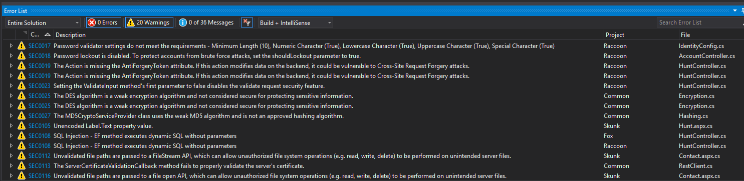 Wait a few moments for Puma Scan to display vulnerabilities in the Error List window. See image for an example.