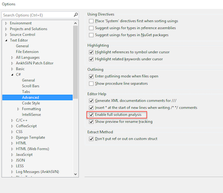 - For prior versions of Visual Studio, check the "Enable full solution analysis" option