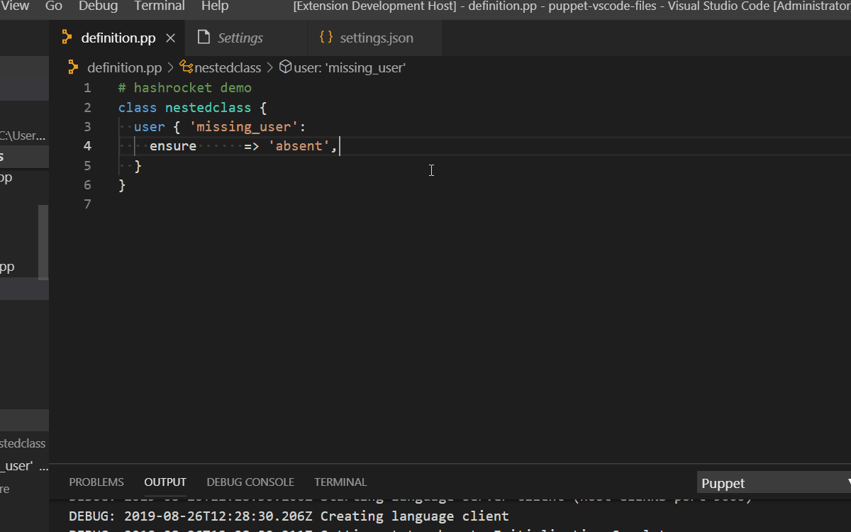 Previously the onTypeFormatting provider was created and responds to client settings, turning it on and off appropriately. This commit actually adds the on type formatter: * Only for puppet manifests (.pp) * Uses puppet-lint lexer to tokenise the document and uses the tokens to determine indenting * Will not operate if the document is over 4KB in size or the client is using tabs instead of spaces * Adds tests for the formatting