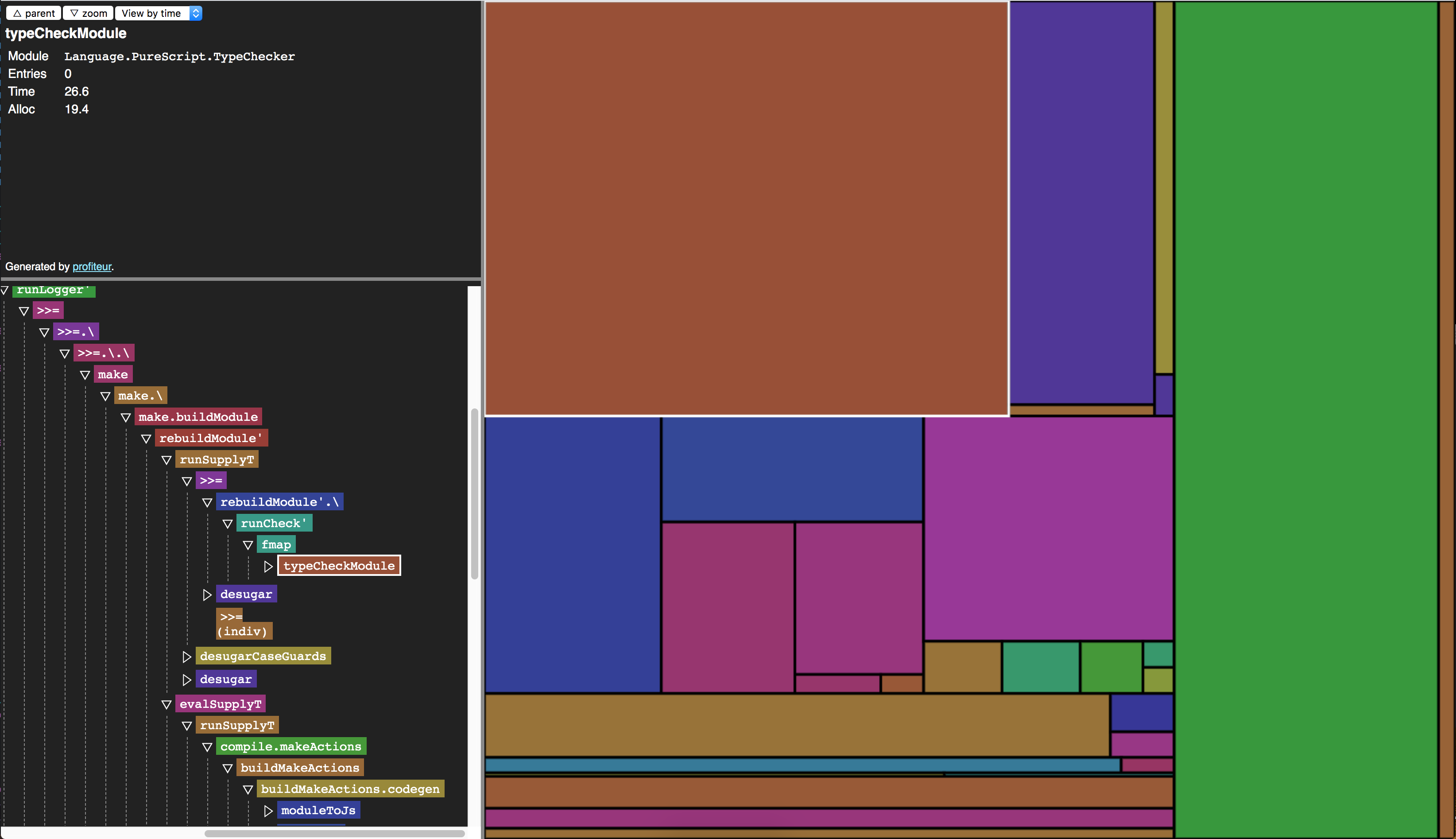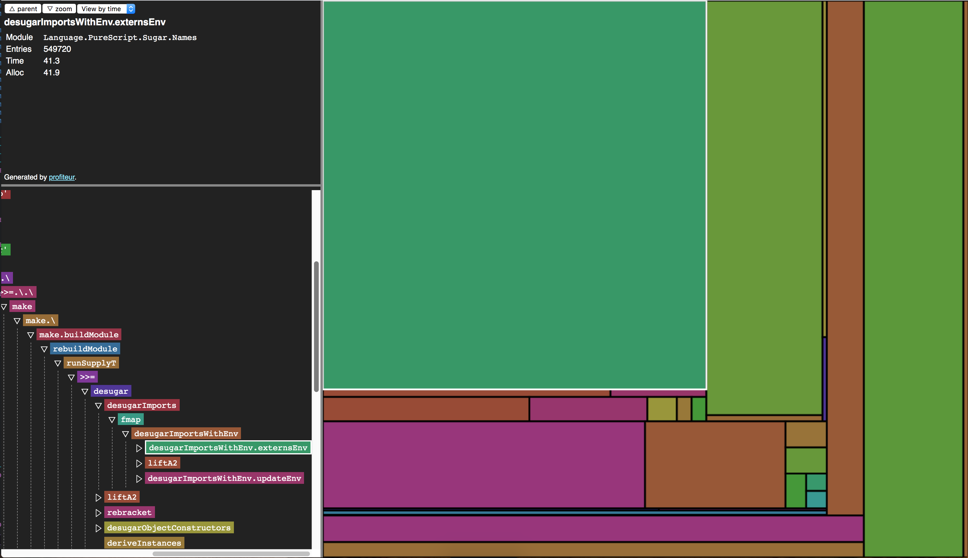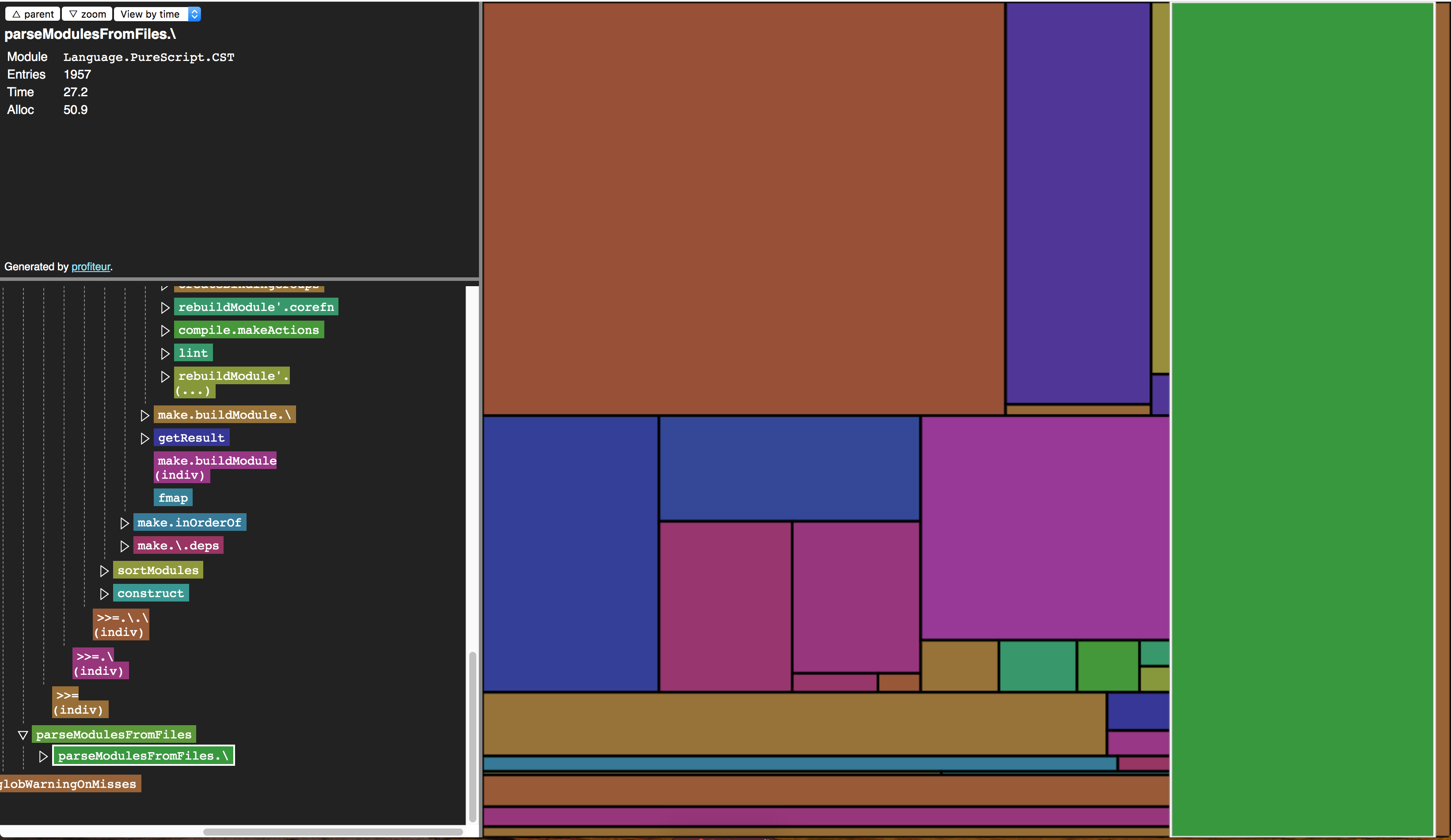 @natefaubion noticed that clean builds at Awake were starting to take quite a while, so I went and profiled one of them. I ran the results through profiteur and noticed that about 41% of the time (and memory) spent on our build was from the function
