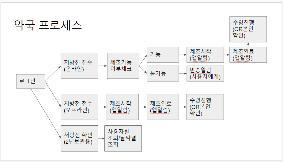 - 약국(처방전 조회, 처방전 접수, 약국 관리, 재고 관리 및 주문)