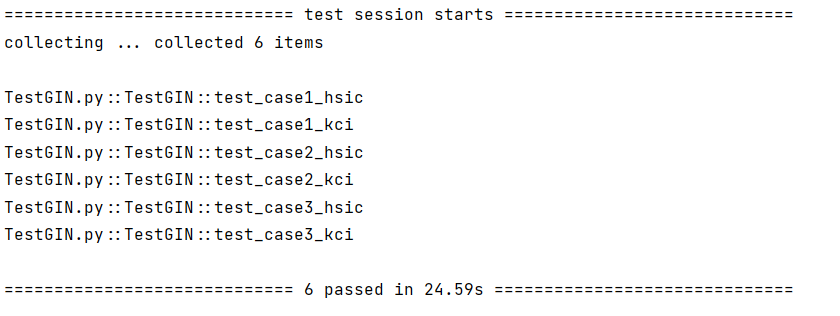 Basically you can test both kci and hsic in a single function, and the only difference seems to be GIN(data, indep_test_method) indep_test_method this parameter.