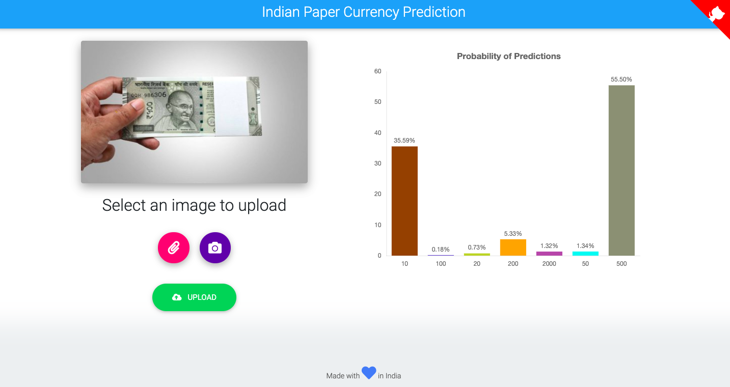 ) takes an image (Indian Paper Currency) as an input and predict the class of image from 10, 20, 50, 100, 200, 500, 2000 denomination.