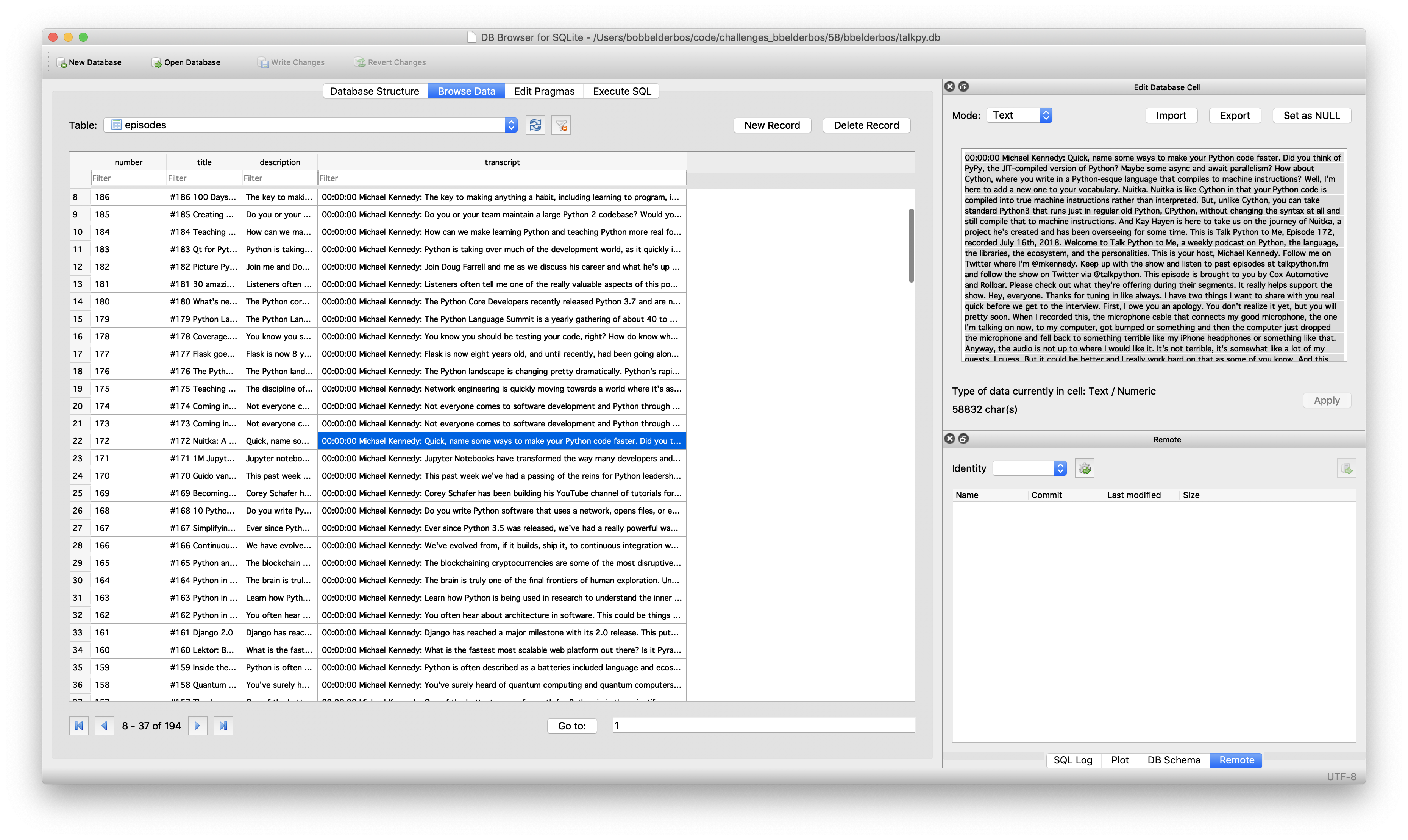 decode("utf-8")to work around some transcripts being stored asbytes(required some debugging),f'{episode_id:0>3}'as alternative forzfill, cur.executemany is awesome as it works flawlessly with a generator of namedtuples, to get row dicts from sqlite useconn.row_factory = sqlite3.Row, I also usedwritelinesfor the first time!]Other feedback (what can we improve?): []