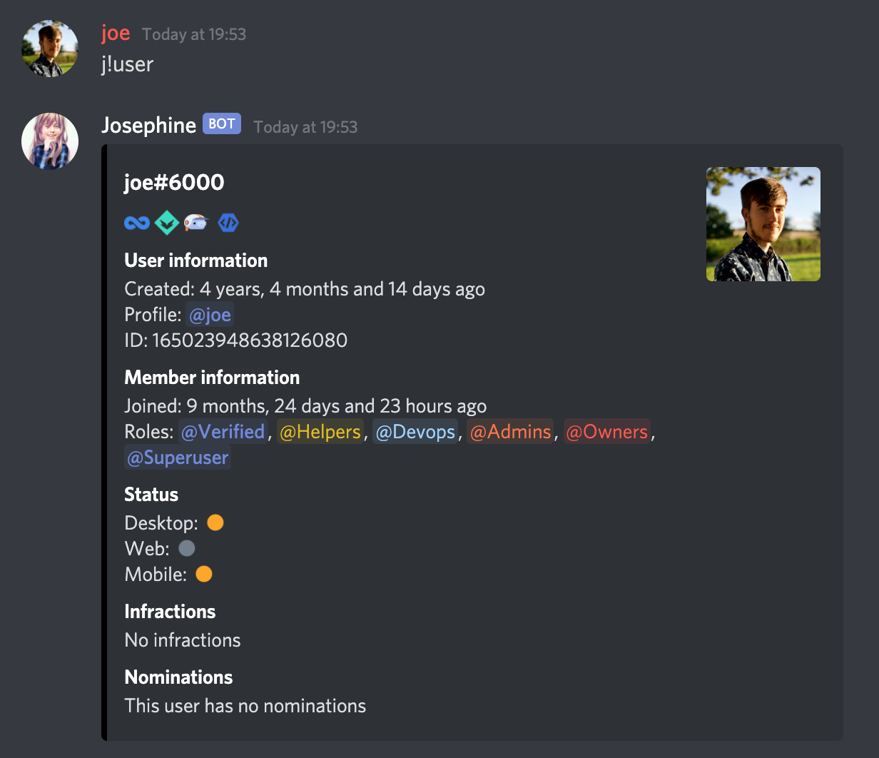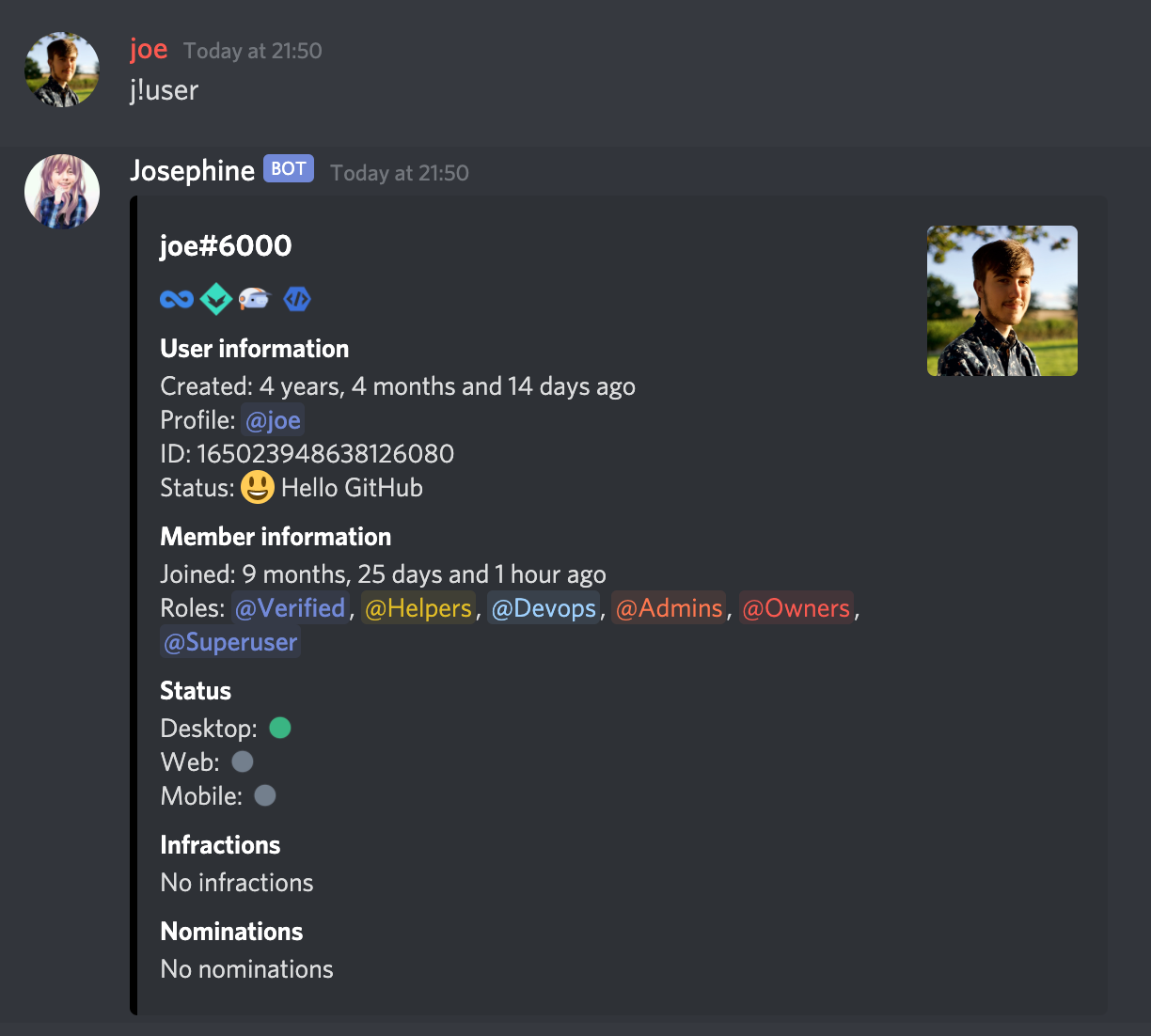 command showing user badges & statuses on all different Discord platforms as well as switching our headers out for embed fields.Resolves #1047.