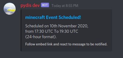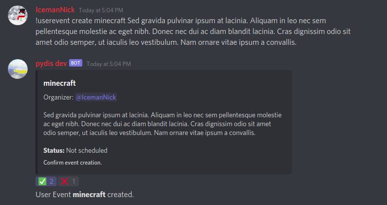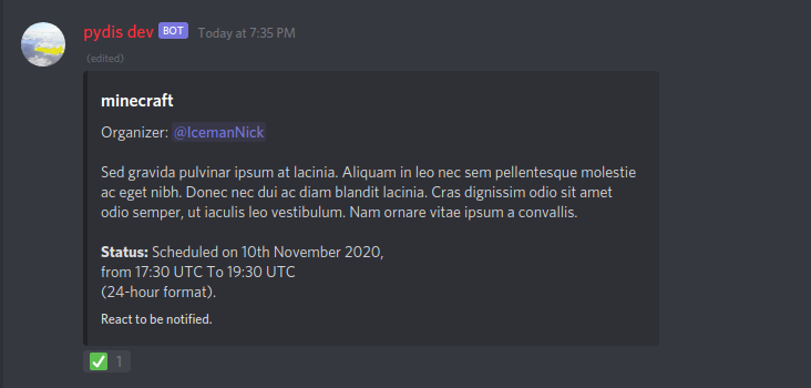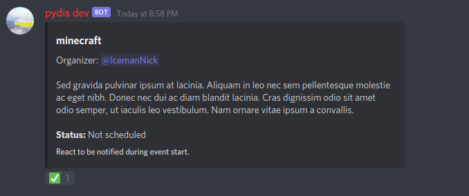 Users will be able to subscribe to the event by reacting to the ✔️ reaction on the message.