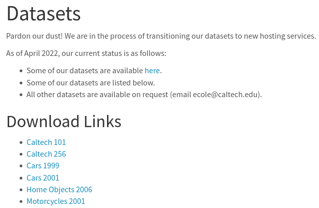 The files are now hosted on GDrive linked under "Some of our datasets are available here.". The links at the bottom for Caltech 101 / 256 seem to feature the same data, but packaged in a different way. Thus, I've opted to just switch to GDrive as source.