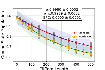 scale = (nrb - 1) / (2 ** nrb)whernrb = 2 ** num_qubits, but I think it was supposed to be(nrb - 1) / nrb, @gadial can you double check this?The second change is to the formatting of the returned figure. The figure now plots the raw unaveraged scatter data, and uses different colour curves for the standard and interleaved fits to distinguish them. It looks like this: