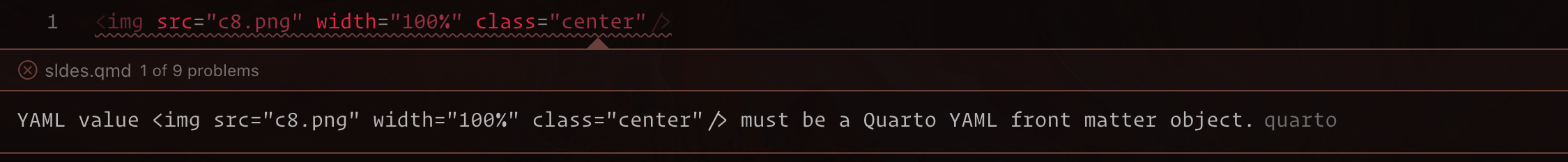 Hi, I use the HTML syntax to insert the image to the slide. It works fine, but the quarto sometime shows it as a problem (although it would render just fine). I'm wondering how can I disable this warning?
