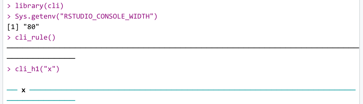 The width of the ─ character, when printed in RStudio console, is greater than the standard single width, causing the message to be wrapped, and thus not very neat. This applies at least to cli_h1() and cli_rule() on a Mac. Below are two representations of some output.