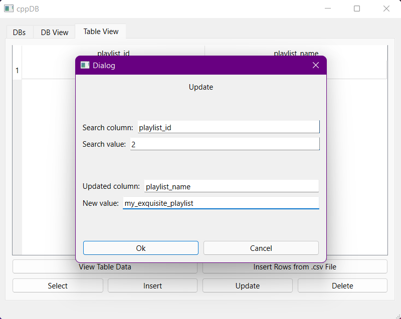 Rows can be inserted, selected, updated, and deleted from this tab.