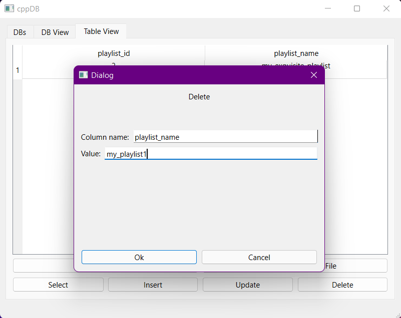 Deleting rows works similarly to selecting them. The program asks for a <column_name> - <value> pair.