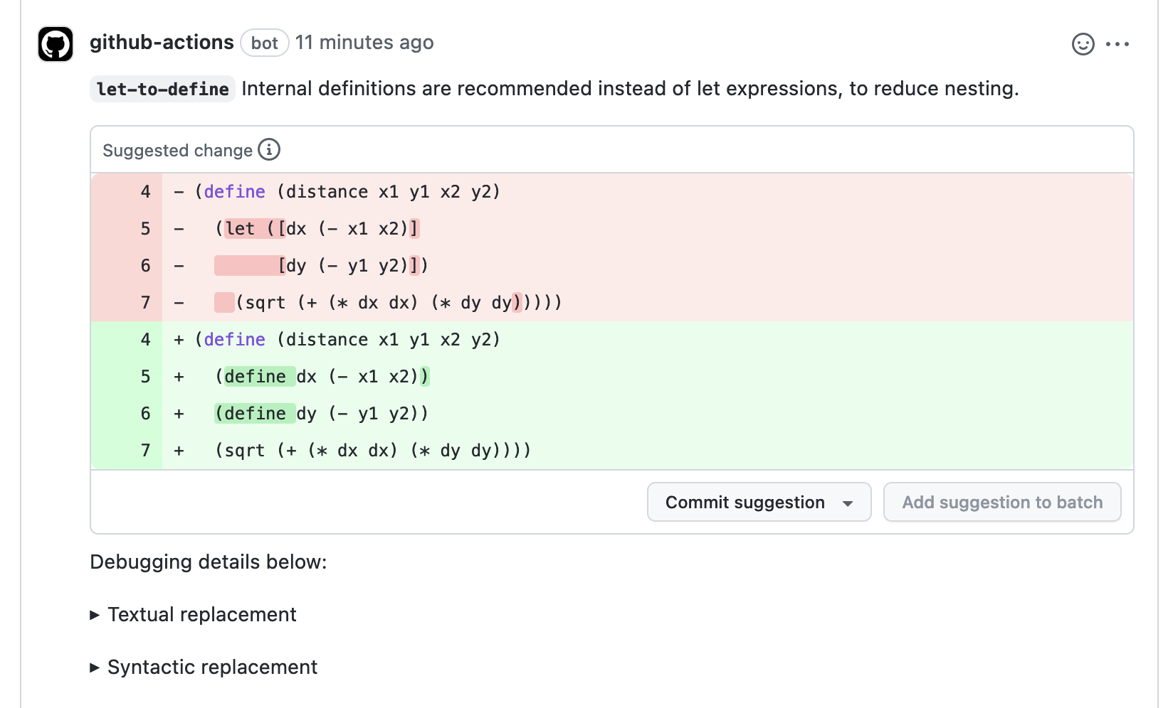 The Resyntax tool and especially the github integration are still in the early phases of development so there are probably several bugs to work out here. If a suggestion looks wonky, @-mention me and I'll take a look at it.