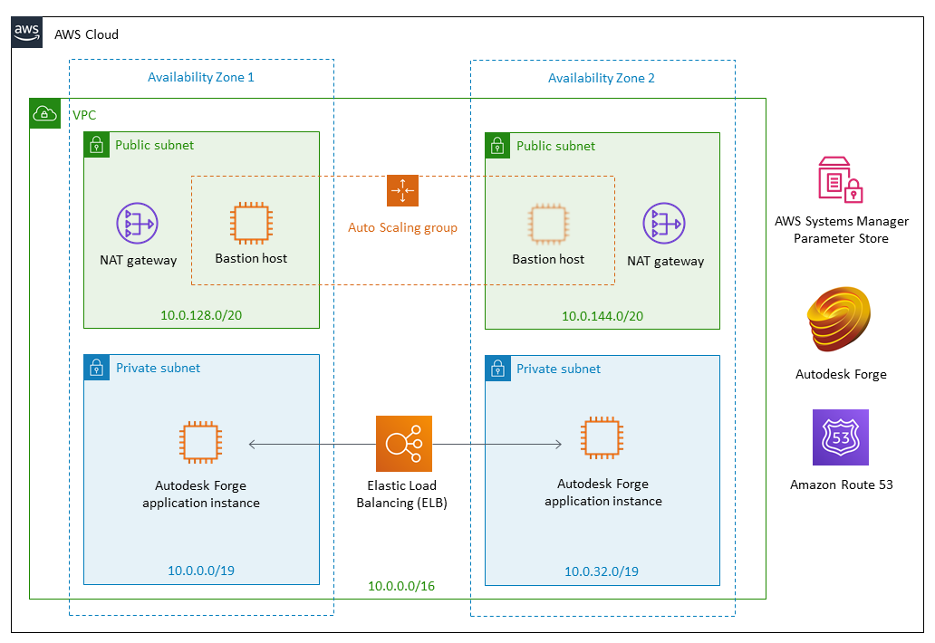 This Quick Start sets up an Amazon Web Services (AWS) architecture and deploys an Autodesk Forge application environment on the AWS Cloud for customizable building blocks in the form of web service APIs, tools, and services. The deployment, which takes about 15 minutes, uses AWS best practices to address common scalability, high availability, and security requirements.