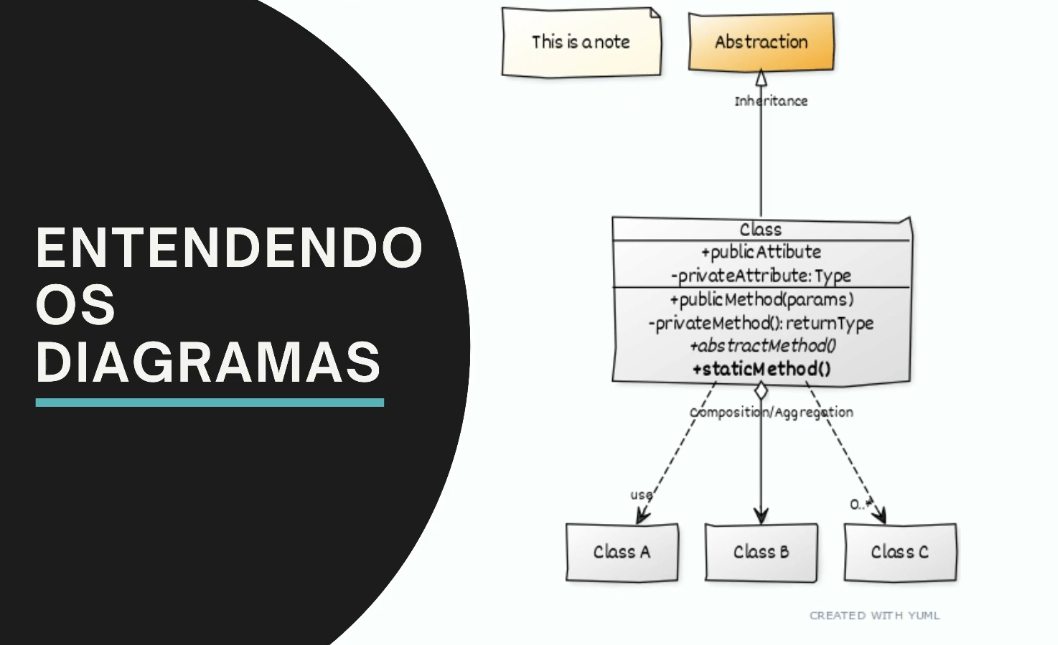 - A seta da Classe para a Abstração (ponta com a seta branca): indica que a Classe implementa uma interface ou herda da mesma.