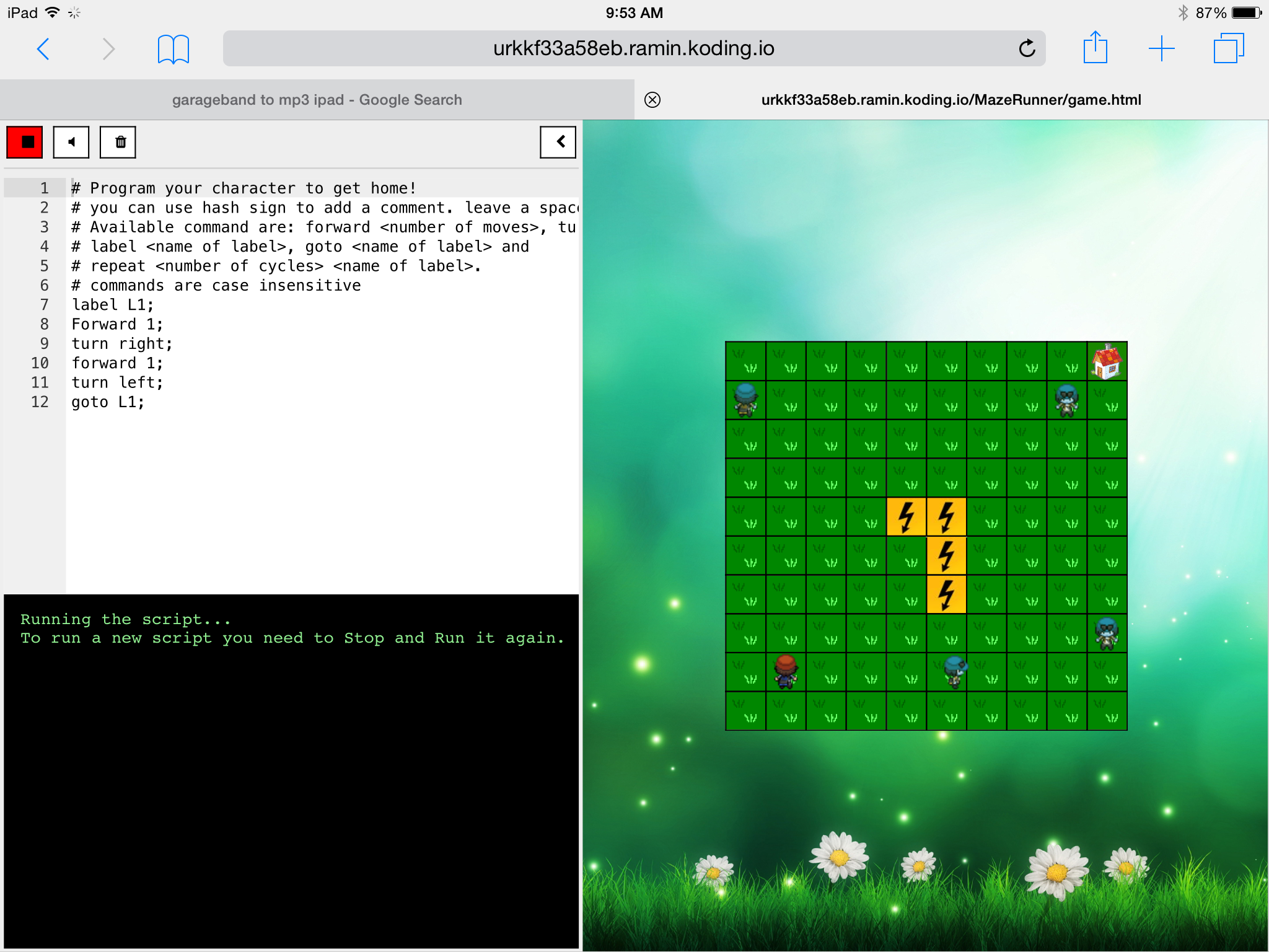 In MazeRunner, the goal is to program your character (Bleen) to get home safely! Code commands are simple and taught gradually to player thorough a series of 8 tutorials. Player will learn about commands, loops and code structures. Here is a quick list of available syntaxes: