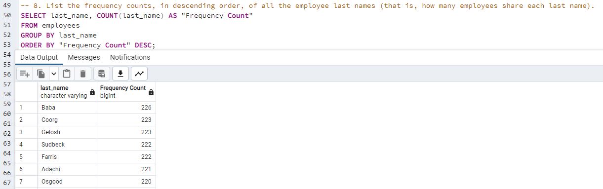 - List the frequency counts, in descending order, of all the employee last names.