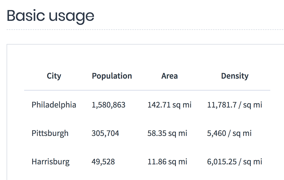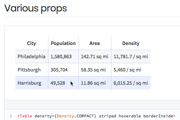 <table>element but affords common customizations via props, eg, density, zebra striping (striped,stripeColor), hovered row highlighting (hoverable,hoverColor,hoverCursor), various border combinations (bordered,borderInside,borderOutside,borderRows,borderColumns,borderHeader,borderColor,borderWidth).With the exception of