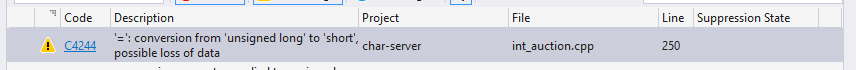 There are 2 warnings after compilation: Warning C4244 '=': conversion from 'unsigned long' to 'short', possible loss of data char-server trunk\src\char\int_auction.cpp line 250 Warning C4146 unary minus operator applied to unsigned type, result still unsigned map-server trunk\src\map\script.cpp line 7901 |