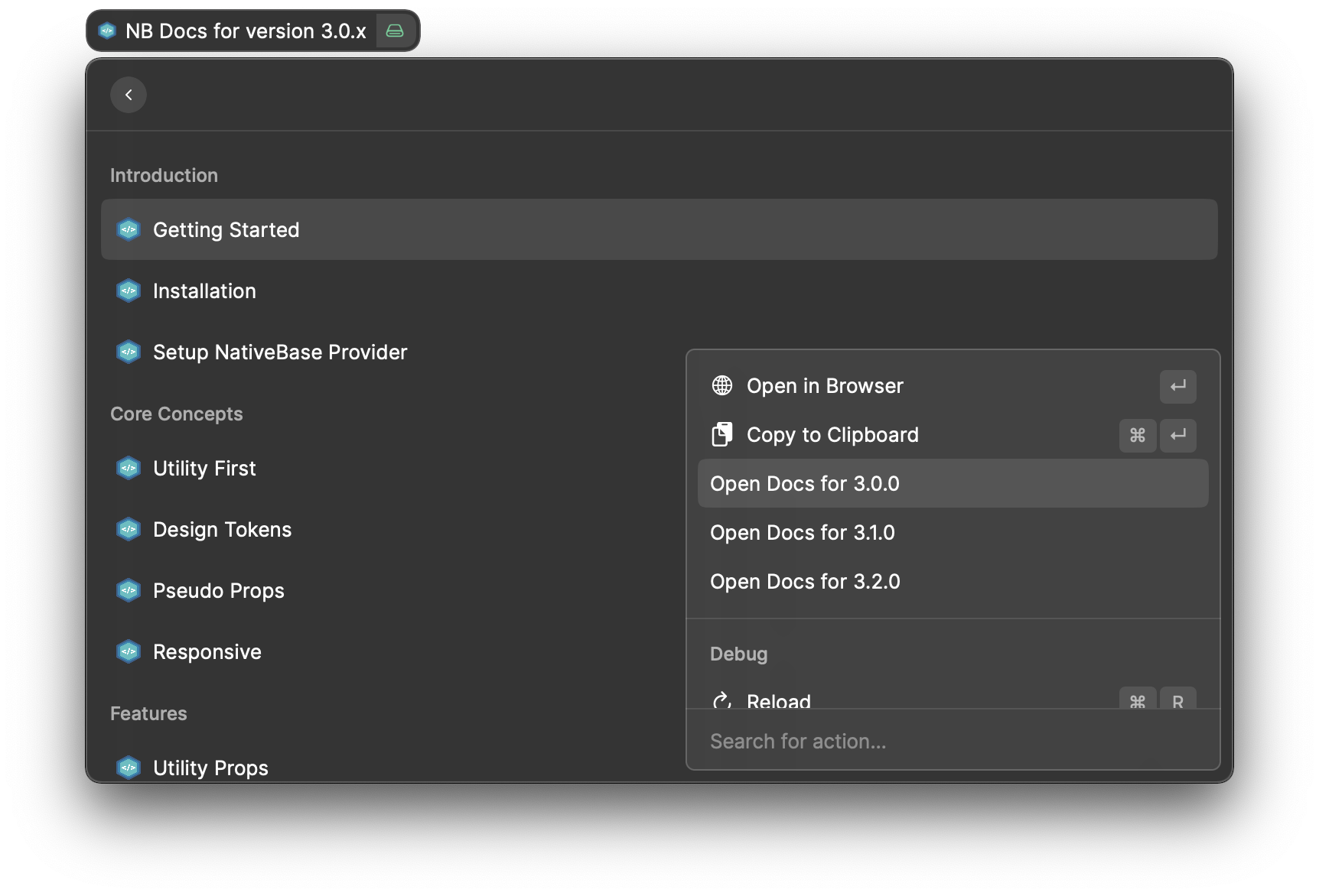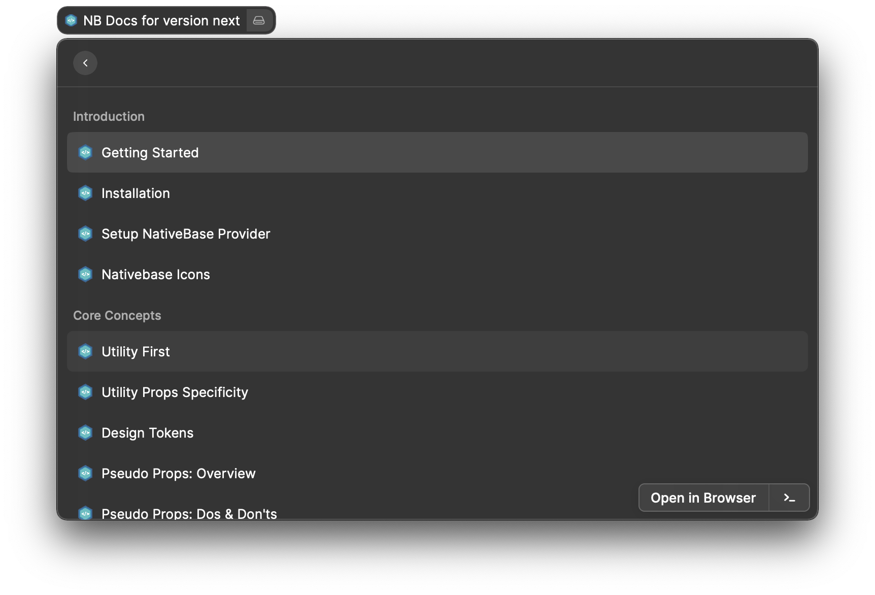 This extensions helps to search the nativebase.io documentation from within the Raycast. It also support different versions of Nativebase documentations.