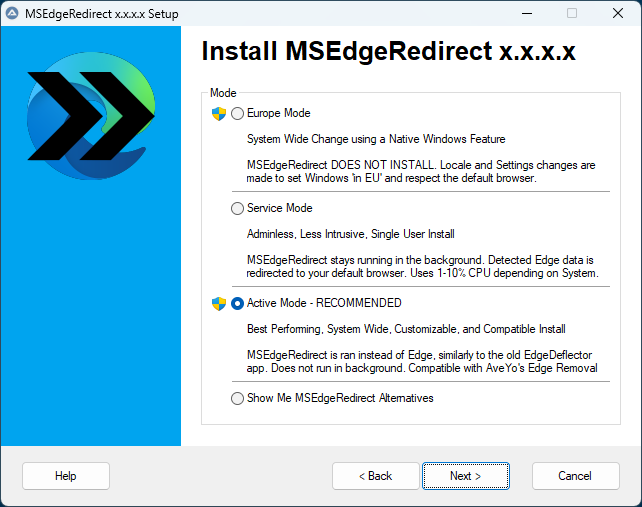PLEASE NOTE: MSEdgeRedirect is still BETA. Changes are to be expected, and performance to be improved.
