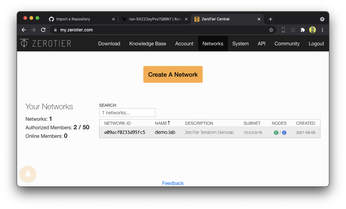 The ZeroTier Network can be found in the Terraform output. Find it by nagivating to the "Outputs" tab of the latest run.