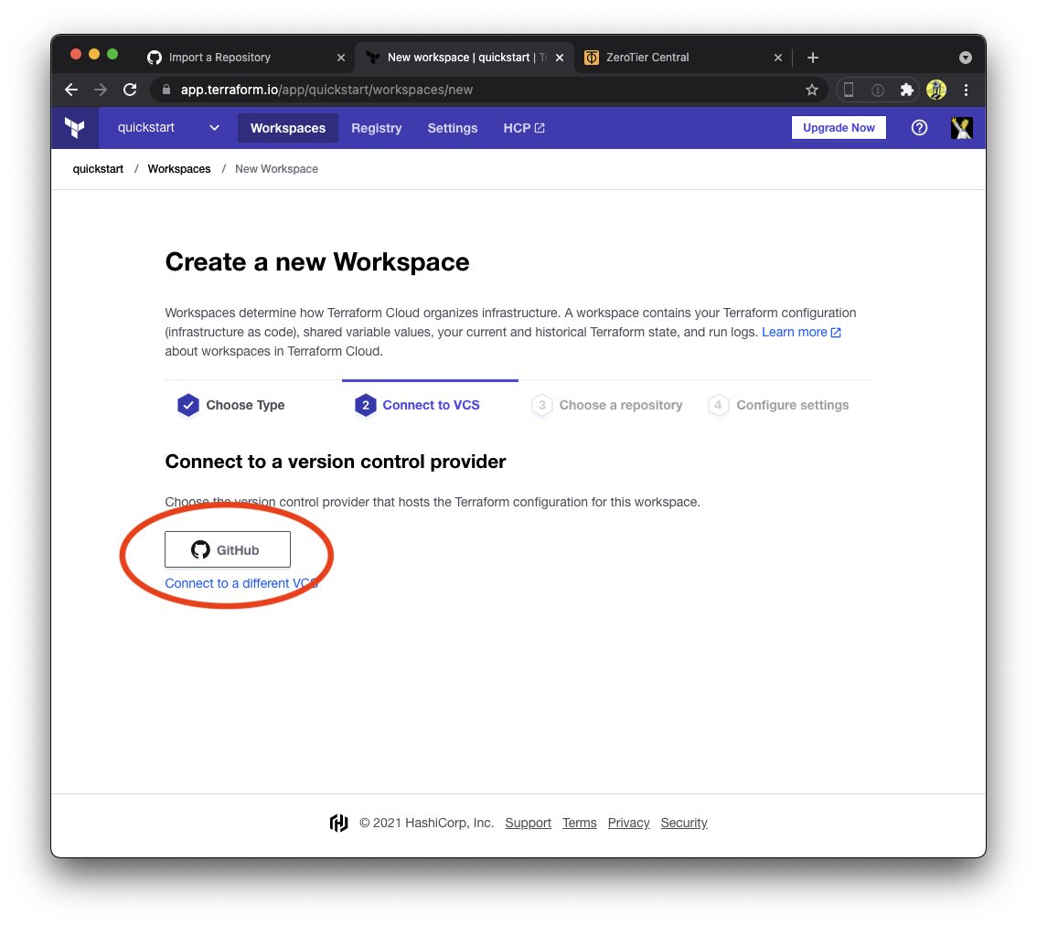 Next, we create a Terraform workspace and attach it to our private Github repository. Be sure to select version control workflow, select the correct Github account, (we want the private copy, not the original), and give it a unique name.