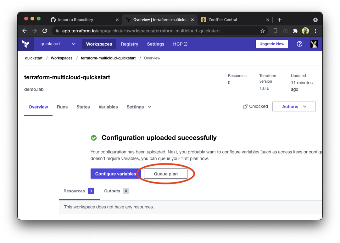 Go back to your workspace and see that it now says "Planned". Every time a commit is pushed to the repo, Terraform will queue a plan. This is the essence of the "Version control workflow" we selected earlier.