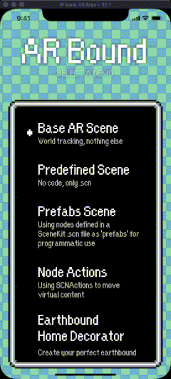 Besides helping satisfy a long unfulfilled desire to make something Earthbound themed, AR-bound was designed to make it easy to quickly test different ARKit features. If you want to try out different features you can easily add a screen to the menu by creating a view controller that derives from BaseARViewController (this gets you the debugging overlays, etc.) and then adding a DisplayInMenu attribute to the class to give it a title etc. Just take a look at any of the existing ones if you get stuck. Menu items are ordered by namespace so use that knowledge to put your screens before or after the baked in ones.
