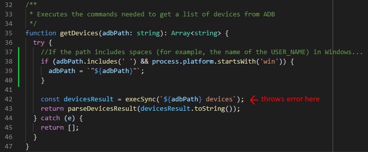 getDevices(adbPath), adbPath have 3 arguments, looks like:So, I fixed this adding