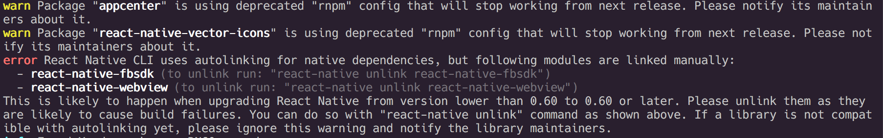 | )}\nThis is likely to happen when upgrading React Native from version lower than 0.60 to 0.60 or later. Please unlink them as they are likely to cause build failures. You can do so with "react-native unlink" command as shown above. If a library is not compatible with autolinking yet, please ignore this warning and notify the library maintainers.`, |