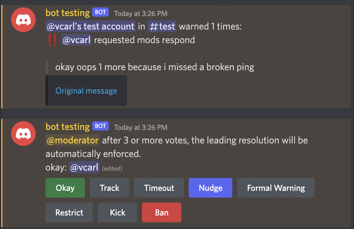 Convene Mods is a new command that extends "track" behavior, pinging all moderators and triggering a poll. The poll closes when 3 moderators have voted, and will automatically enact the resolution that wins.