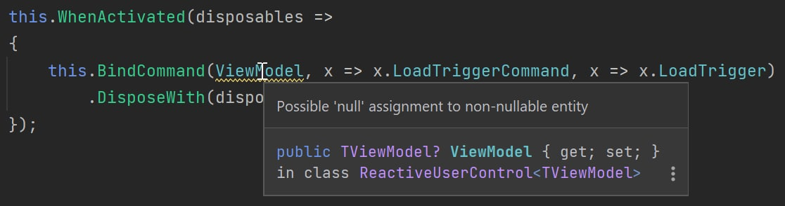 BindCommandrequires theTViewModelto not be null, although in fact the parameter doesn't have to not be null, we are using the parameter for generic type resolution only. The view model parameter is only used in one place insideBindCommand, we are passing the parameter to theReflection.ViewModelWhenAnyValueextension method, and the ViewModelWhenAnyValue extension method doesn't require theTViewModelto not be null.What is the new behavior?