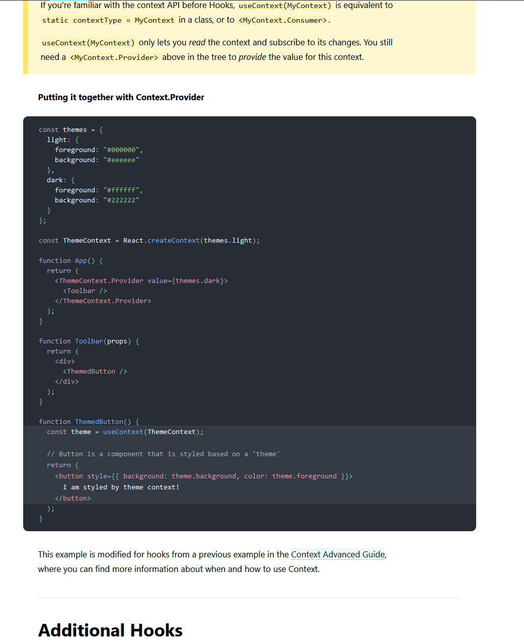 Provideror aConsumerand where the hook fits in. I deliberated on where to place this example for a bit, but it seems that the docs don't mention hooks at all in any of the previous posted articles (such as the Context page under Advanced Guides).Finally, I tried to use the existing intro code example in