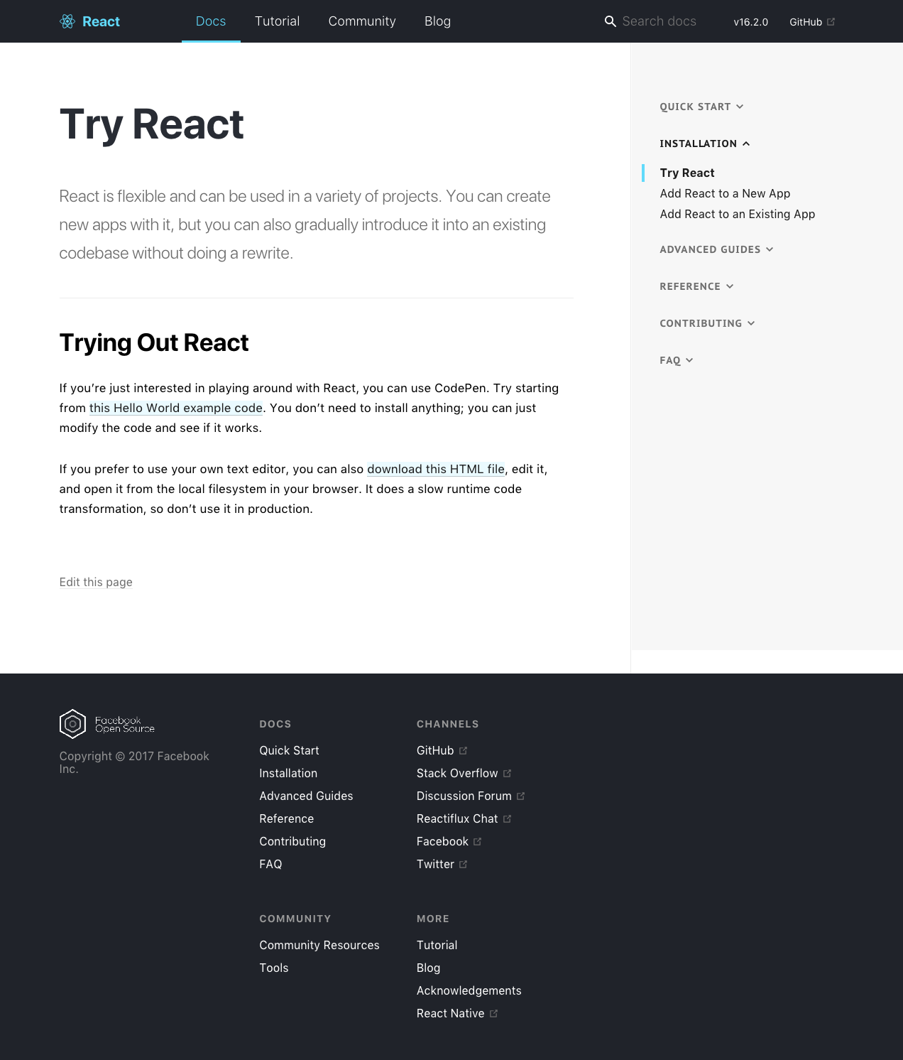 "Quick Start > Hello World" mentions that you can use React from CodePen without installing anything, but then again so does the first page of the new "Installation" section.