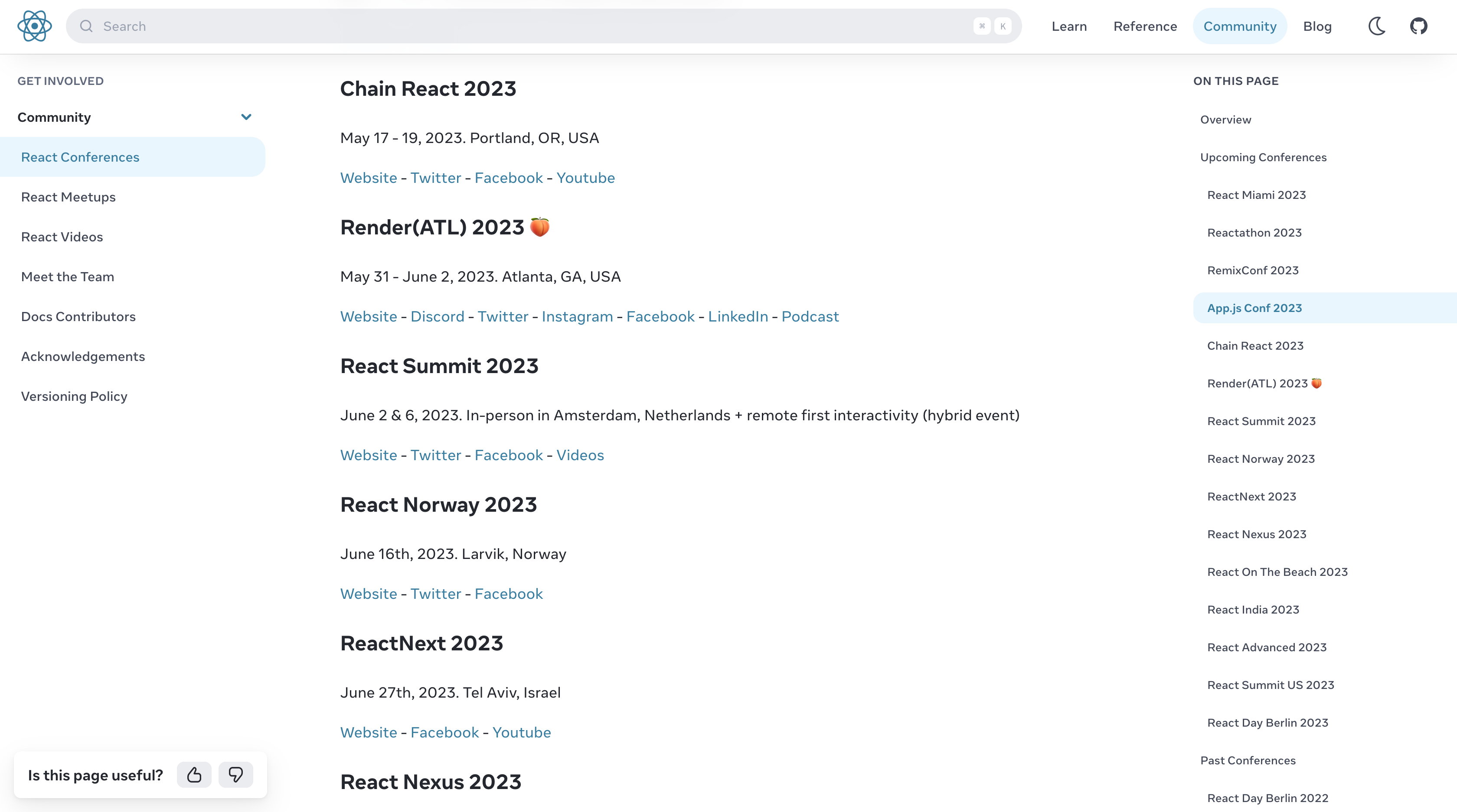 Hi @gaearon , @harish-sethuraman & @hernanif1 , here is the addition of Chain React 2023 - Portland, USA, with a screenshot attached.