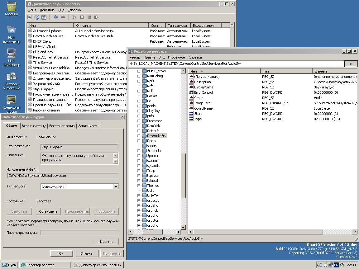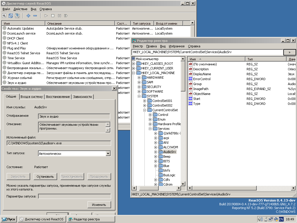 base/services/audiosrv/audiosrv.txt(just description of audio service, it doesn't make any changes in the system);boot/bootdata/hivesys.inf(registry values of the audio service);dll/cpl/mmsys/mmsys.c(audio properties cpl part, which calls it also, when changing audio settings);sdk/include/reactos/libs/audiosrv/audiosrv.h(service name itself, as it named in the system and visible to other system components and to user).Result