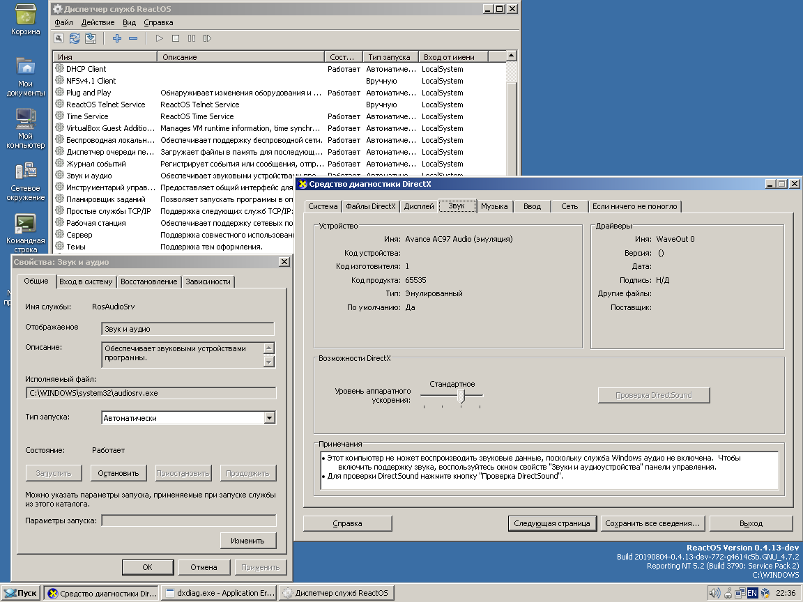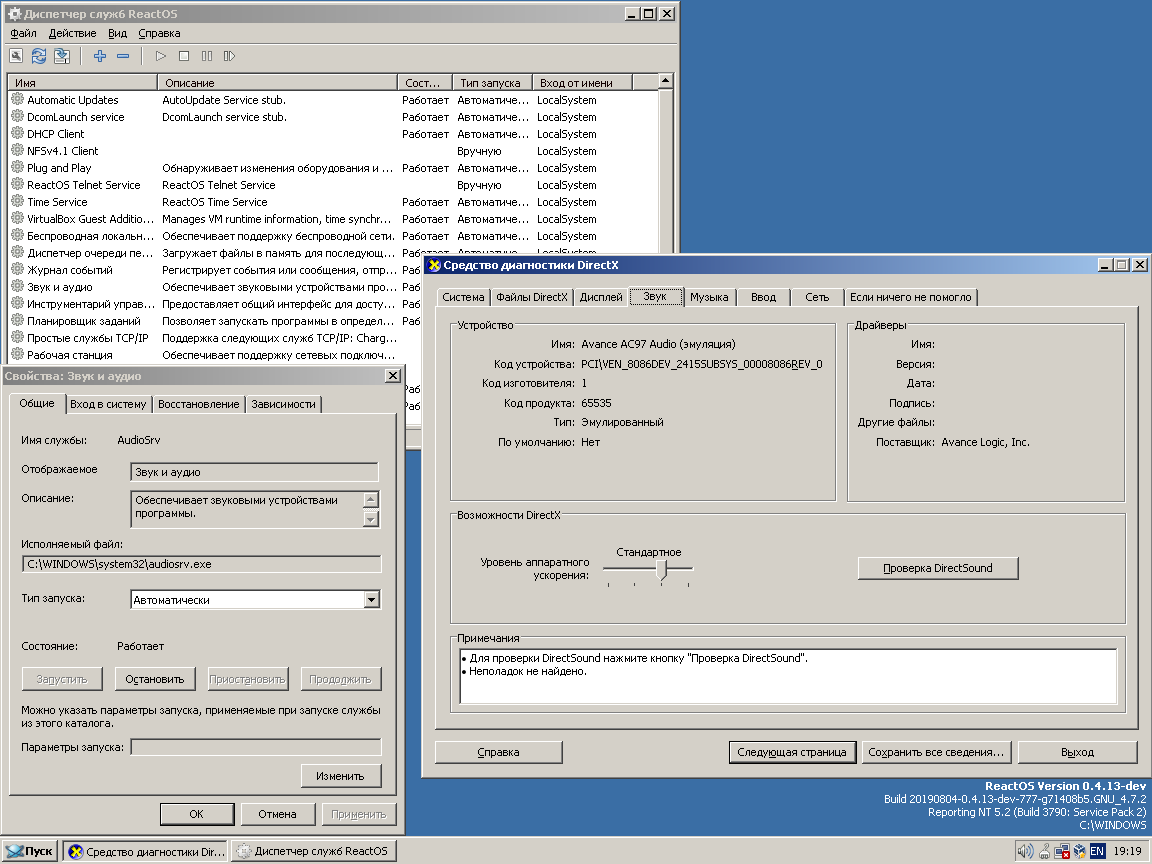 It allows MS DxDiag to detect the system audio service correctly, so it becomes possible to run DirectSound test properly with MS dsound.dll, although it works with some minor errors and only in older VirtualBox versions, ~ up to 5.1.38 (and in other emulators as well).