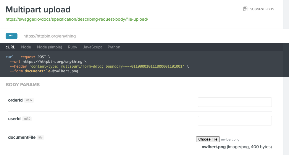 multipart/form-datacontent types in order to accommodate library utilization within the browser where the nativeFormDatacomponent is used.form-dataandFormDatathat was causing the library to fail in the browser were two issues:FormData.appendhas three arguments, and the third should only be present if the second is aBloborUSVString. It is never an object, asform-datarequires it to be.FormData.pipe()isn't a function.requesttarget that was causingfs.createReadStreampointers to be stringified and unusable.param.fileNameif it's present, even ifparam.valuealso is:requestrequesttarget to prefer single quotes inrequirestatements andrequest.cookiecalls. Since the rest of the snippet already preferred this, this change makes the whole snippet look a touch more cohesive and consistent.Since I'm not sure on how we can actually test the browser side of things within this library, you can instead test it out with this PR in the Explorer repo: readmeio/api-explorer#867. That is currently loading this PR within the