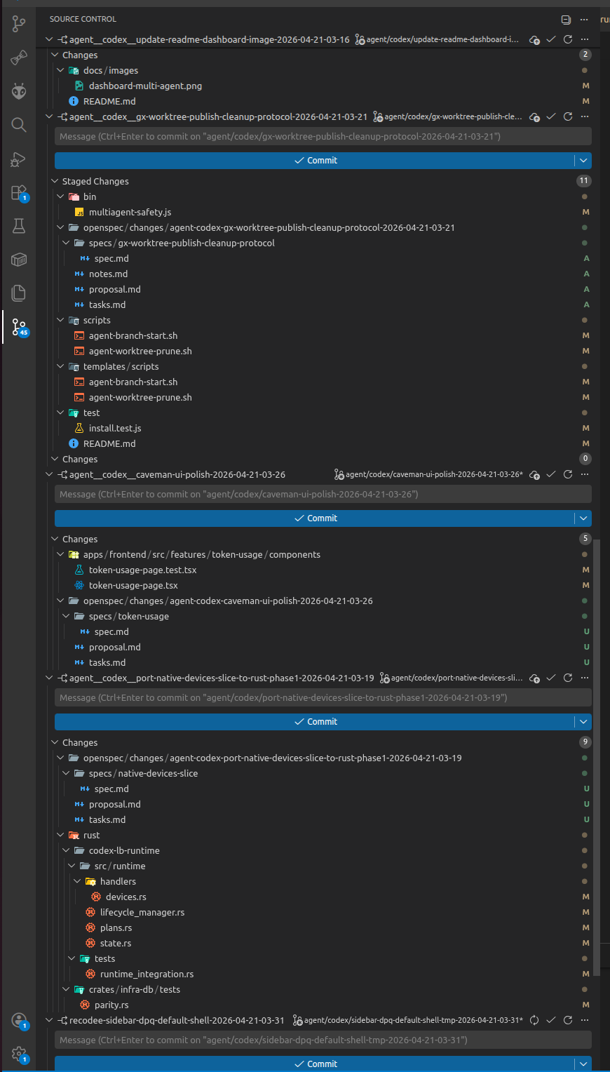 This is the real Source Control shape GitGuardex is aiming for: isolated agent branches, clear OpenSpec artifacts, and no pile-up on one shared checkout.