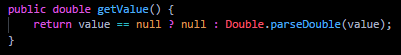 public double getValue() { if (value == null) return null; else return Double.parseDouble(value); }