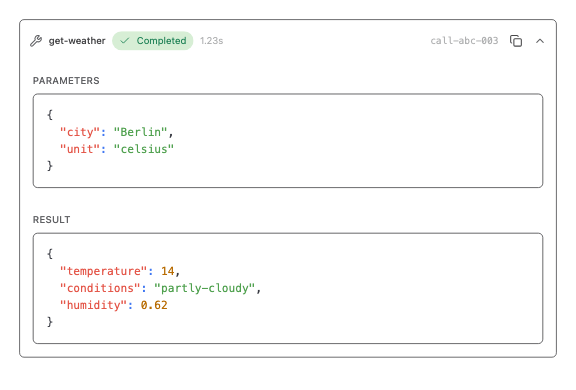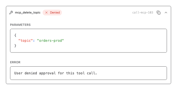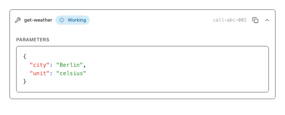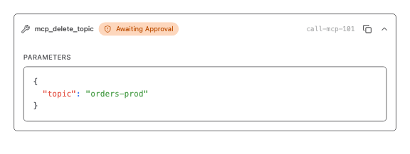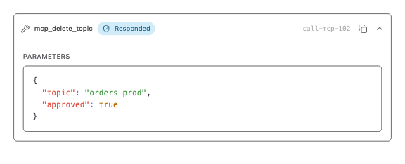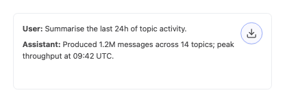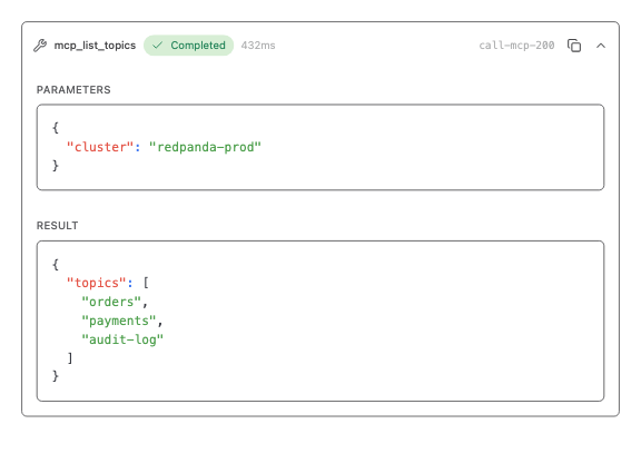 • Trigger a tool call; confirm Tool card renders with Redpanda badge