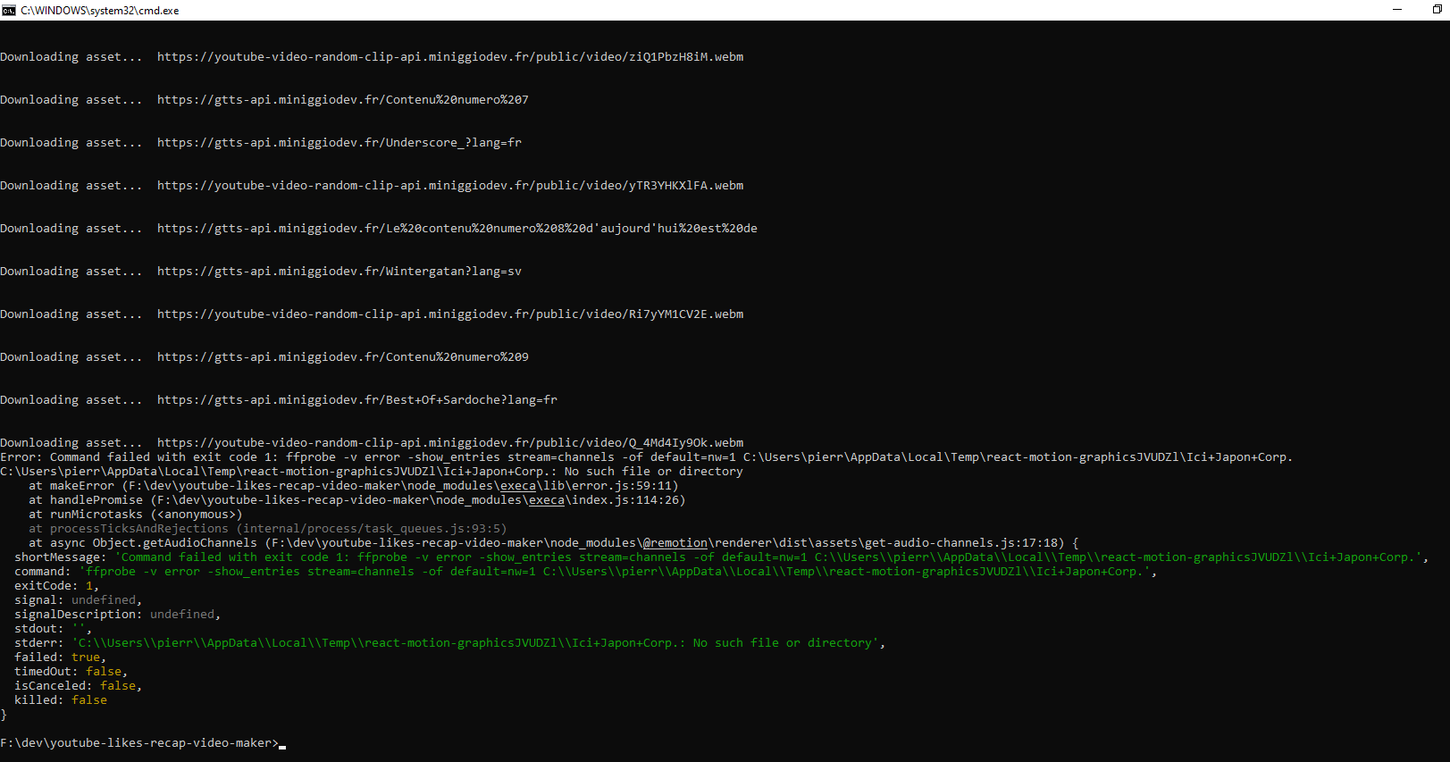 Error: Command failed with exit code 1: ffprobe -v error -show_entries stream=channels -of default=nw=1 C:\Users\pierr\AppData\Local\Temp\react-motion-graphicsJVUDZl\Ici+Japon+Corp.