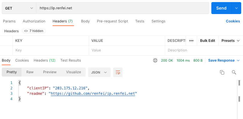 那么我就让他访问一下 ip.renfei.net 把他的IP告诉我,如果只想要 IPv4 的地址,那么就访问 ipv4.renfei.net