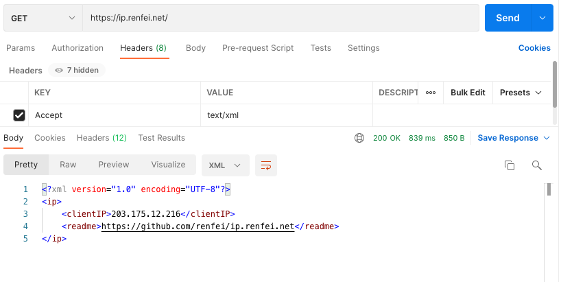 Accept请求头时,或者声明了不支持的Accept请求头时,默认以 JSON 格式返回,例如如下情况你会得到下面的响应结果:返回 XML 格式