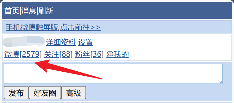 访问 weibo.cn 并登录。点击用户 id 下方的“微博”