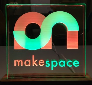The Makespace sketch for the Makespace logo display has two rows of nine LEDs (LED zero nearest the cable entry). The default sequence rapidly fades up white light, then slowly increases colour saturation before going dark and starting over. Uses 4678 bytes (71%) of program storage space, 167 bytes of dynamic memory.