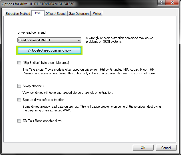 Hit "Autodetect read command now". It shouldn't take long. Leave everything else unchecked unless you're having problems. You can checkmark "CD-Text Read capable drive" if you want to test whether your drive can do it. If it can, great, otherwise, uncheck it. It's unlikely you'll ever use that feature anyway.
